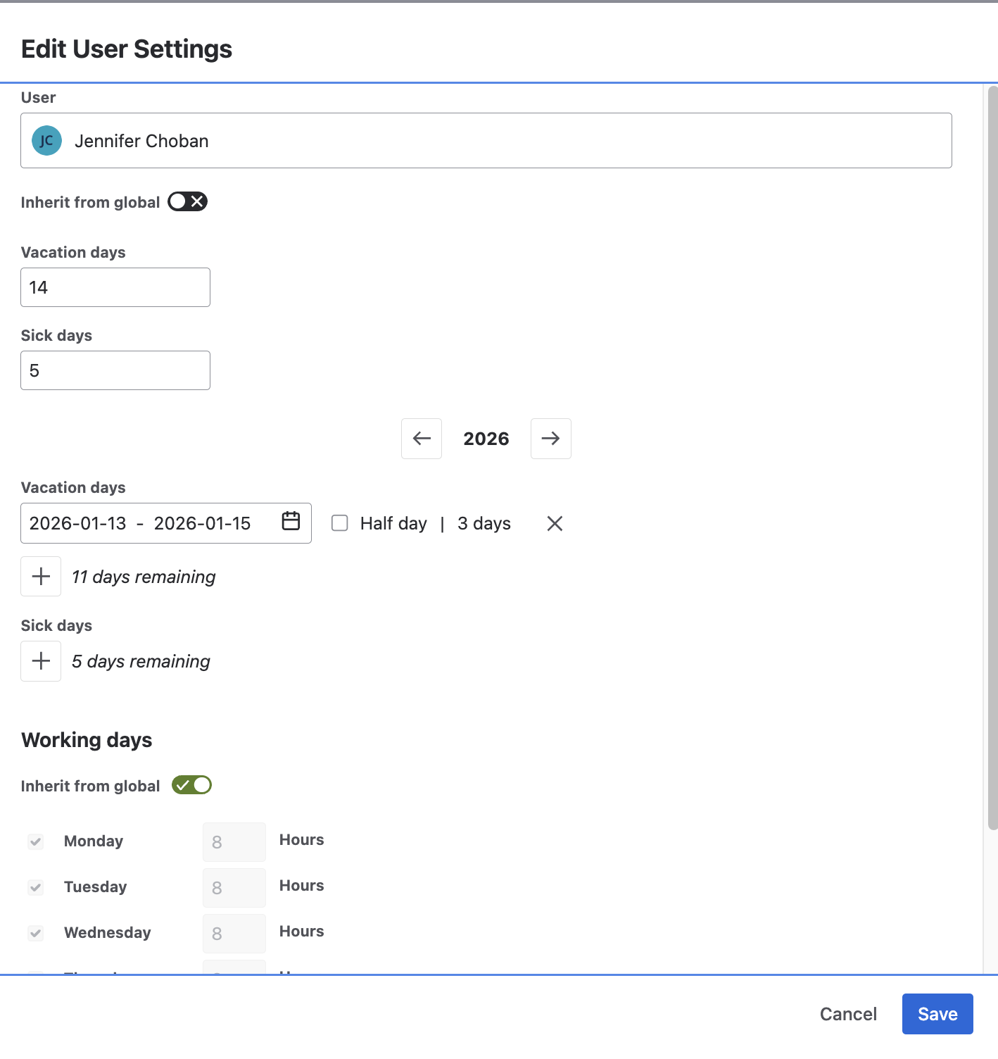 Jira admins can edit a user’s number of allowable vacation and sick days.