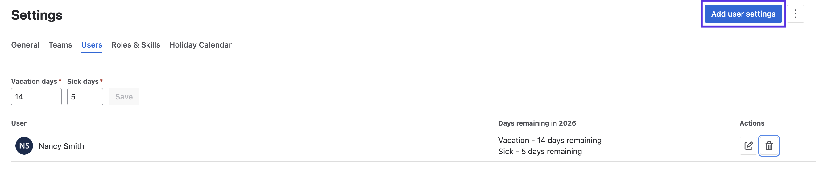 You can set the number of allowable vacation and sick days that can be taken, both globally and per user. When users schedule time off, their remaining days will be recalculated and their availability will be updated in the Capacity Planner.